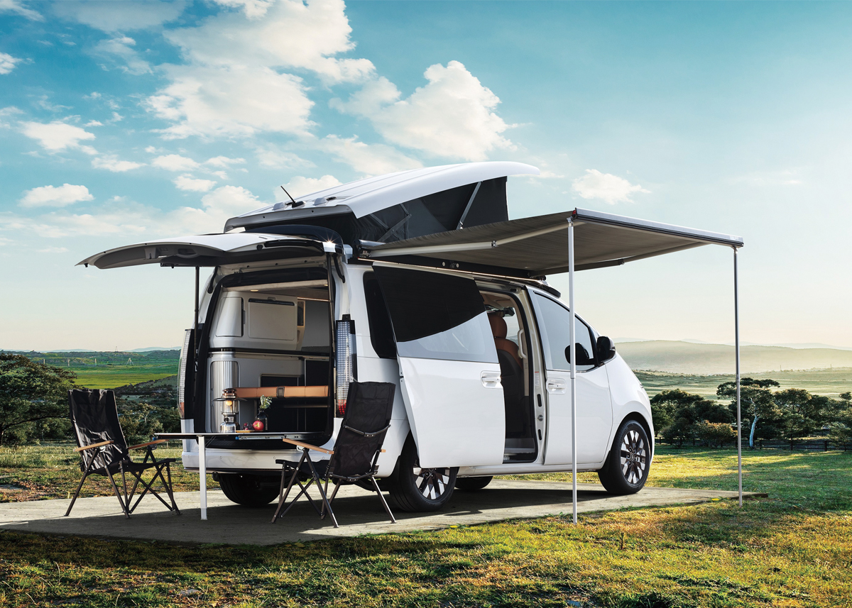 캠핑 관련 차량을 꾸준히 선보이는 현대자동차가 4월 출시한 MPV(다목적 차량) 모델. 넓은 실내 공간, 거실과 침실로 변하는 풀 플랫 시트와 전자동 팝업 루프 시스템으로 더없이 여유로운 느낌을 선사한다. 사이드에 장착된 어닝 시스템을 펼쳐 타프 대용으로 쓸 수 있다. 내부에는 싱크 수전 세트와 36L 빌트인 냉장고, 접이식 테이블이 배치되어 있으며 모기장과 탈착 가능한 야외 샤워기로 여름 캠핑을 돕는다.